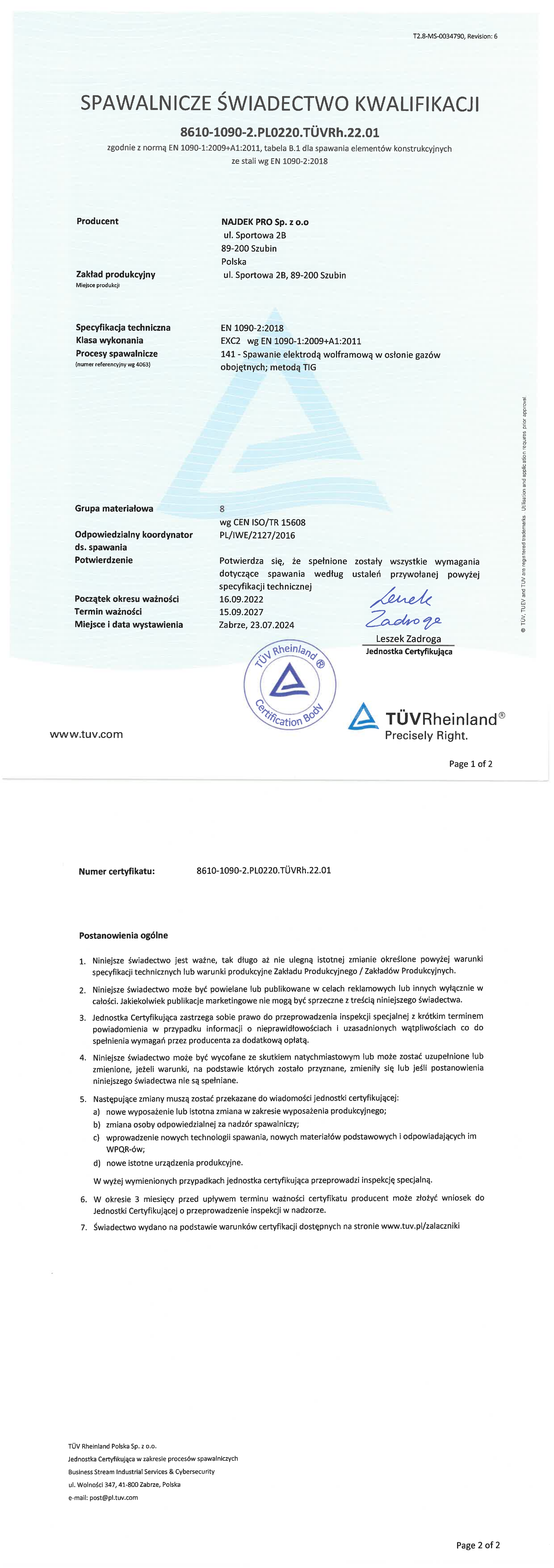 Firma Najdek posiada certyfikaty pozwalające na sprzedaż i wprowadzenie do obrotu naszych wyrobów na rynku europejskim.